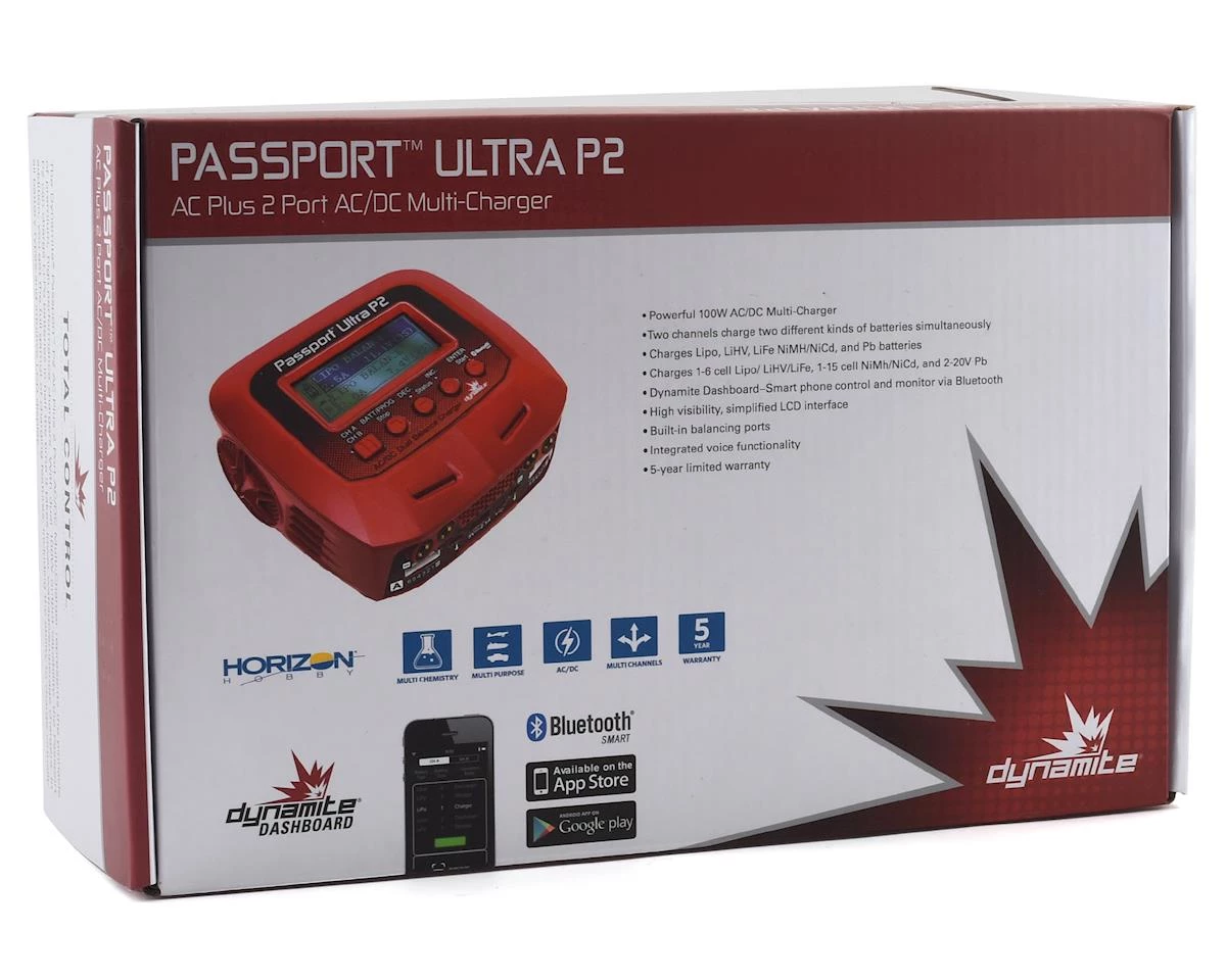 The Dynamite Passport P2 100W AC/DC 2-Port Multicharger with Bluetooth Connectivity provides seamless integration to select Dynamite “P” Series chargers by bringing real-time monitoring to your mobile device. You can monitor the charge status of your batteries, view real time battery stats including; battery type, battery cells, charge current, voltage, battery capacity, battery charge level and more. Simply download the app, pair your mobile device to the compatible Dynamite P-Series charger via Bluetooth and take advantage of viewing real-time charge stats while monitoring your battery’s charge process. With Bluetooth communication, the Dynamite Dashboard puts your charge setting control at your fingertips.