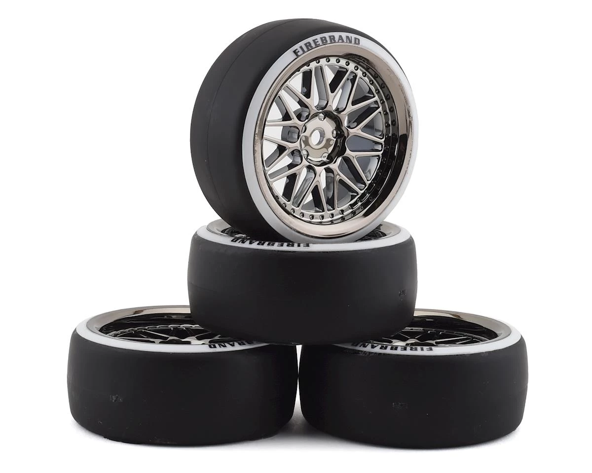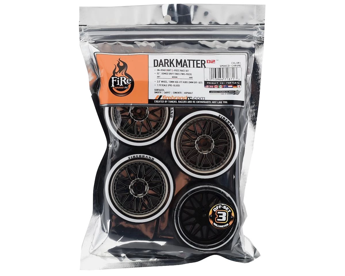 Firebrand Darkmatter D23 Pre-Mounted 2-Piece Slick Drift Tires feature a smoke chrome color 20 spoke wheel that looks good at any speed! The wheels arrive at your door fitted with ultra low-profile, low-traction, 2-piece ABS plastic-piped D2 drift tires. These drift wheels and 2-piece, white-wall tires are made from the highest quality ABS plastic and rubber materials available, and fit most 1:10 scale, on-road, radio-controlled cars. DarkMatter-D2 drift wheels are available in SMOKERS-CHROME white-walls and, if desired, can be painted with poly carbonate paint. Package includes four premounted tires.