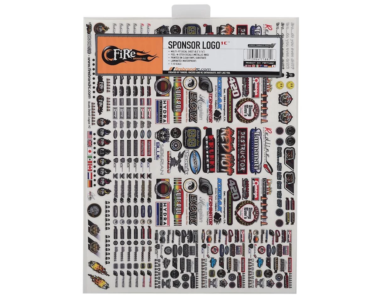 Firebrand Sponsor Logos 1C decals are super-scale. These decals are printed using 8 colors, including white and metallics. These vinyl decals are die-cut for easy application and are printed on the best substrate available. 8.5″ x 11″ sheet.Â
